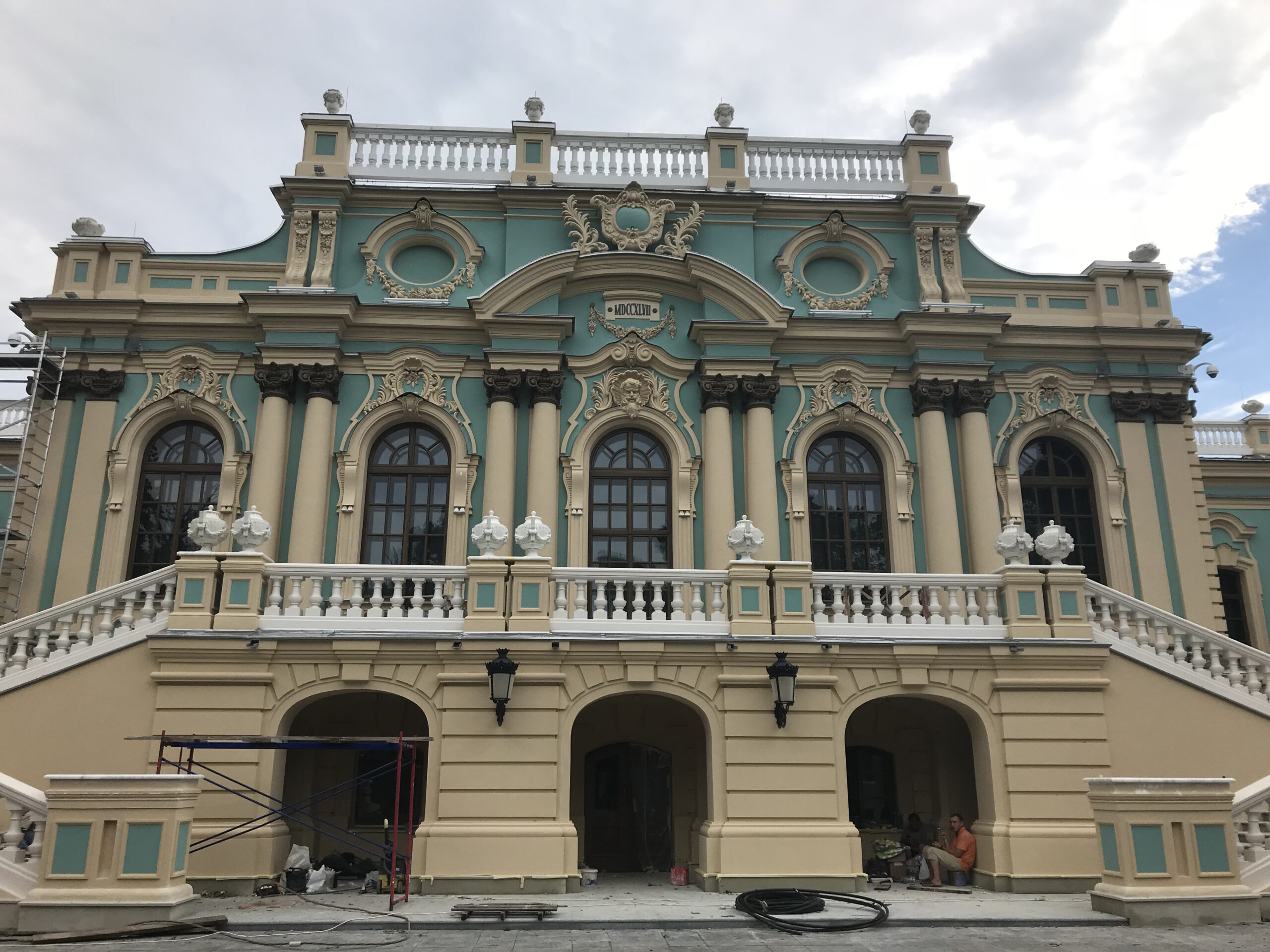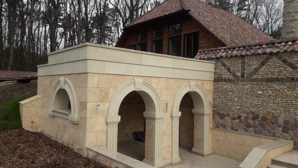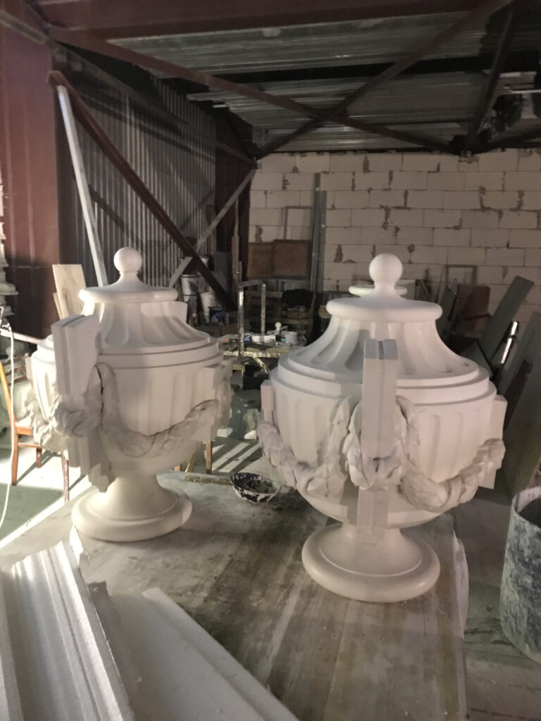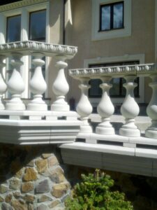 Archstone, polymer concrete, and gypsum molding. A set of works on manufacturing and installation while preserving the authenticity of the fence, urns (closed planter), and unique interior molding.
