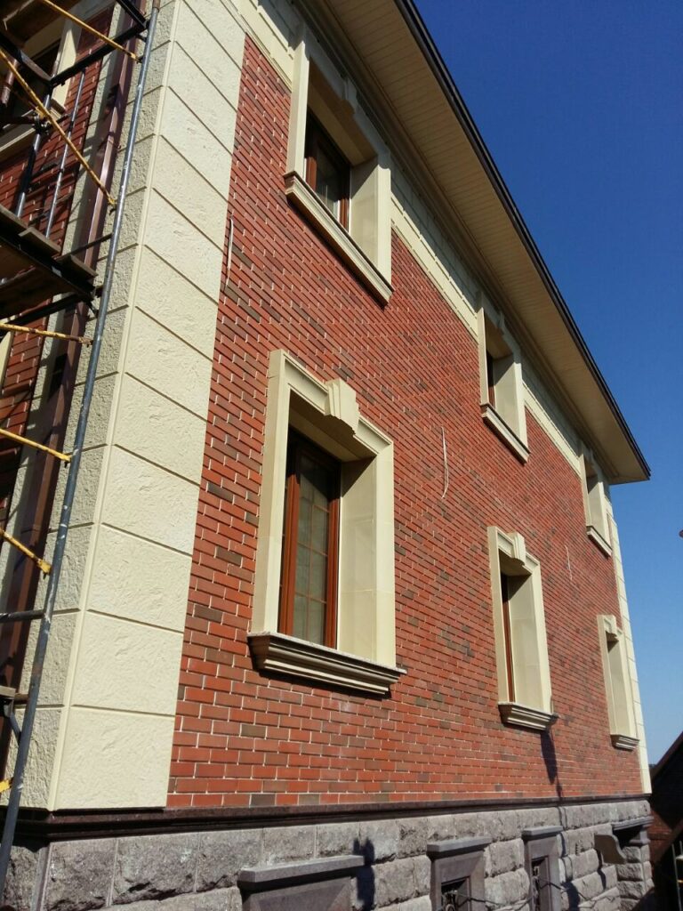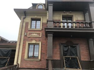 Combined facade with polystyrene decor and gypsum molding. Complete range of work on insulation and decorative facade finishing.